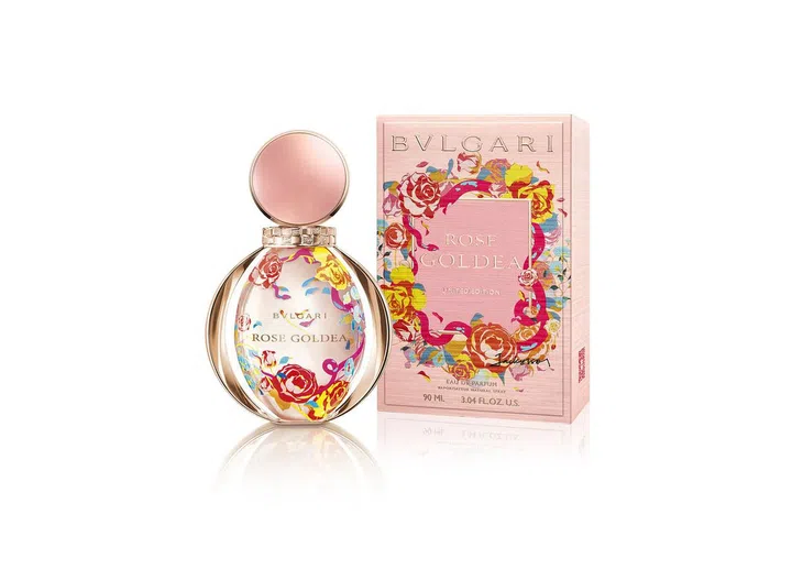 宝格丽Rose Goldea香味从品牌Serpenti珠宝系列取得灵感,幻想灵蛇在百花盛开的玫瑰园里滑动,充满着魅惑之神秘感。这支限量款香水瓶是品牌跟Jacky Tsai联手打造,彩色玫瑰花爬上的瓶身与流动的粉色香液相映成美丽的图案。