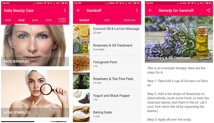 适合追求天然有机的人士,提供多种配方组别。例如,进入美发>分叉,进入的页面显示9个家庭配方,使用鸡蛋、木瓜、酸奶等等来应付头发分叉。其他资讯还有协助你改善肤质或发质的饮食、运动建议等等。