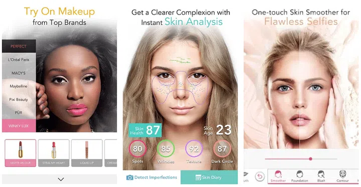 这款程序能够准确辨识你的脸孔,从而让你试用程序里的各种虚拟妆容。内容根据眼妆、指甲、美发、护肤等等来分类,进入各个组别就能看到相关图片与影片,也可编辑照片、分析肤质。