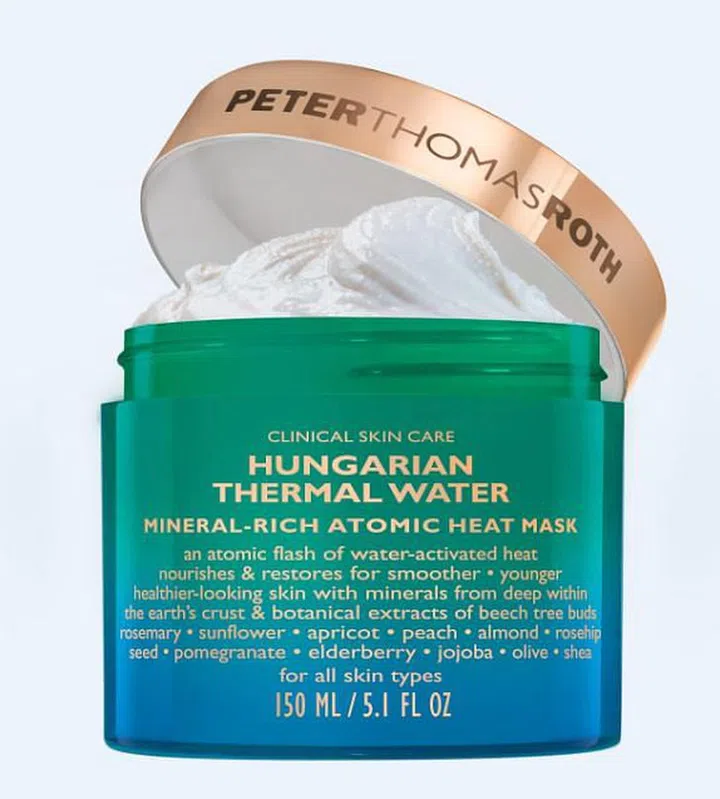 Peter Thomas Roth的匈牙利温泉热敷面膜(Hungarian Thermal Water Mineral-Rich Atomic Heat Mask)接触水之后会产生温热感,有助于打开毛细孔,清洁脸上污垢,同时能够调节肤色,让肌肤回复明亮。