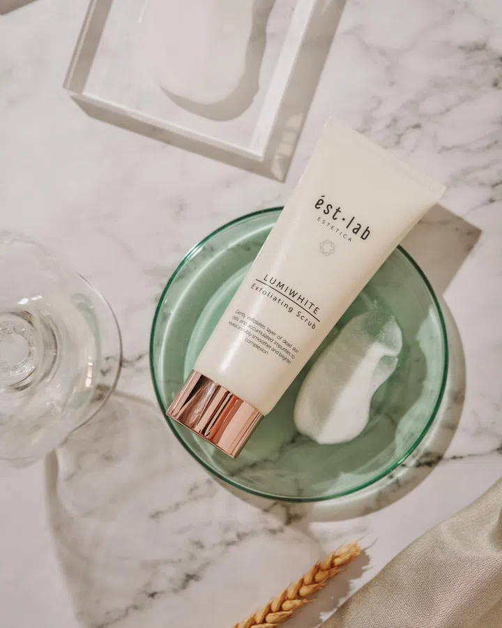 本地美容品牌Est.Lab升级版 LumiWhite Exfoliating Scrub去角质霜加强配方,加入维他命C、荷荷巴油与生物糖胶,质地温和,在去除肌肤油脂与老化角质,同时滋润肌肤。它能够改善肤色不匀、黑斑问题, 让肌肤更透亮。