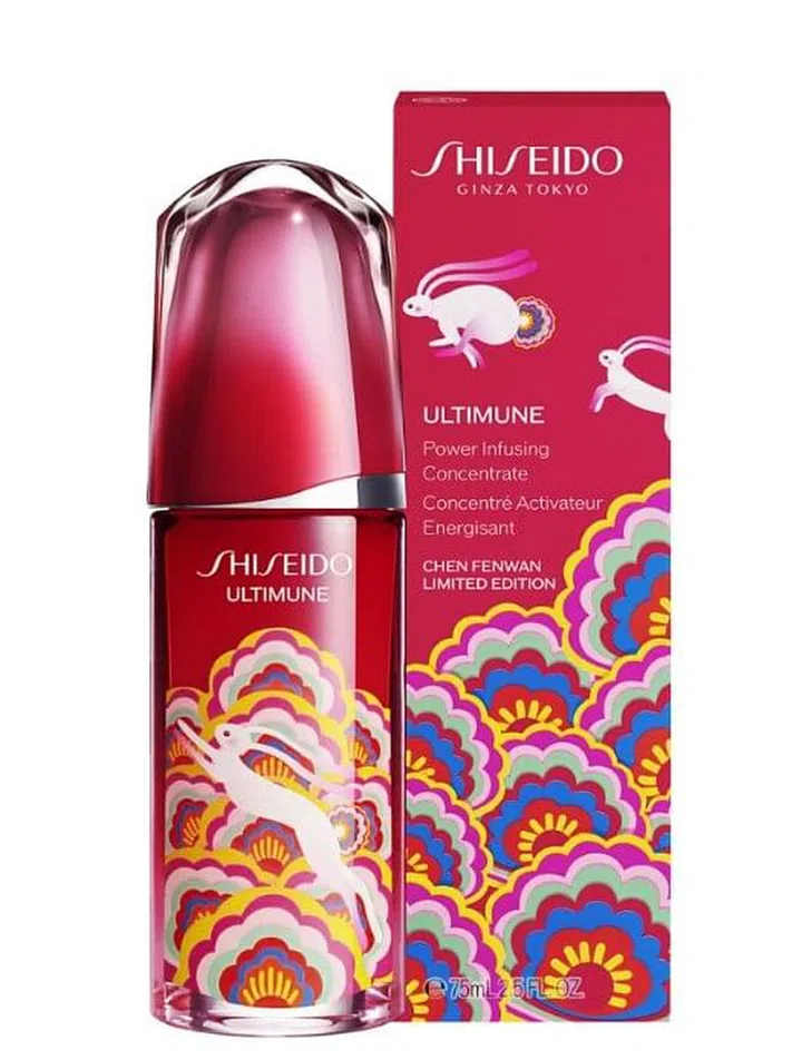 日本资生堂(Shiseido) 兔年限定依然以品牌主打“红腰子” Ultimune Power Infusing Concentrate 精华为主打,包装盒上印制了跳跃众的兔子,姿态轻巧灵动,下方则是以如繁花般鲜艳璀璨的折纸图案,象征着如狡兔般跃入新的一年。