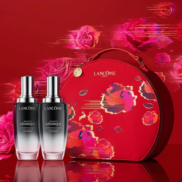 兰蔻(Lancome) 以生气勃勃的火红限定包装迎接新的一年,人气精华小黑瓶限定款双瓶出售,有好事成双的美寓。购买的话还会附赠印上圆形化妆箱,非常应节。今年,品牌也与本地“甜点皇后" Janice Wong联手,购买超过$480产品就送上一盒”玉兔呈祥“饼干礼盒。