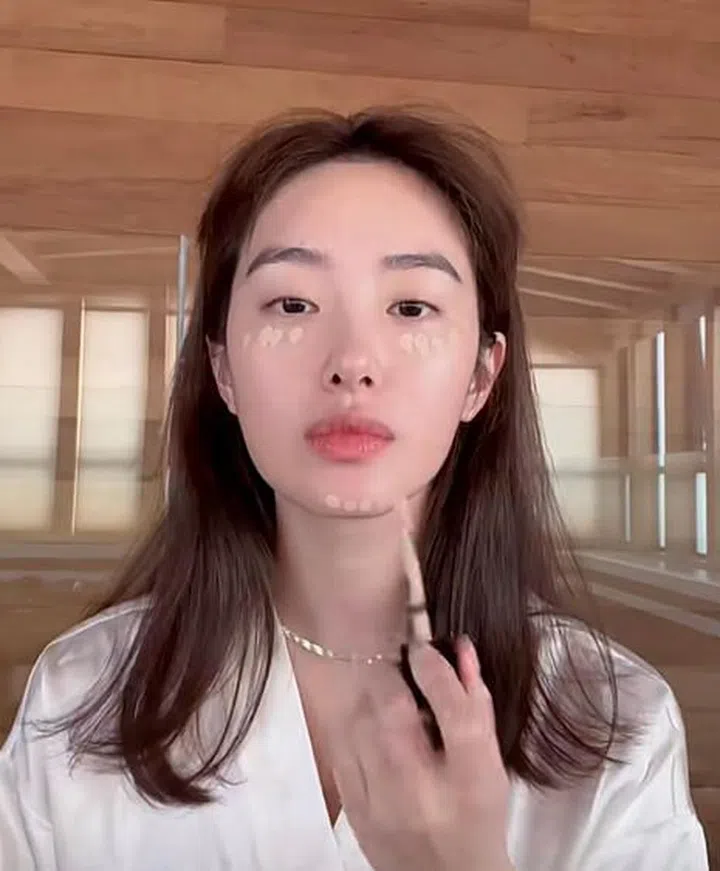 自然妆容的重点在于不着痕迹的底妆,自带宛如天生的微光感,更显元气活力。她选用了具有保养功能的粉底精华,轻擦在整张脸上,打造润泽光感;接着使用水感质地的慕斯粉底,匀亮肤色。另外,她透露自己钟爱用指腹上妆,认为手指肌肤的温度可以让彩妆产品上脸时更服帖细腻。完成粉底步骤后,她再用润色遮瑕笔,在需要遮瑕的部位如鼻翼和脸颊两侧,重点加强修饰。许多女生会使用蜜粉定妆,但她考虑到自己是干性肌肤,加上为了保留脸部自然的光泽感,一般都会省略蜜粉步骤。