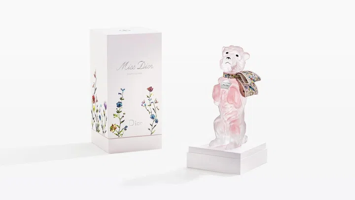 Dior Beauty 在2021年推出以创办人迪奥先生爱犬Bobby 为雏形的Miss Dior Bobby 香水,外形细腻入微,狗狗Bobby 的脖子上还围上了精致的领巾,让人爱不释手。这条领巾是由品牌高级订制工坊的师傅在黑白相间的千鸟格纹蝴蝶结上,一针一线亲手缝缀数百颗色彩缤纷的绣珠,异常珍贵。今年七月,品牌推出同款再版,全球限量3200瓶,附上有号码的精品书,同样以花香味的Miss Dior 为主,自7月1日起,独家在Dior Beauty Boutique 销售。