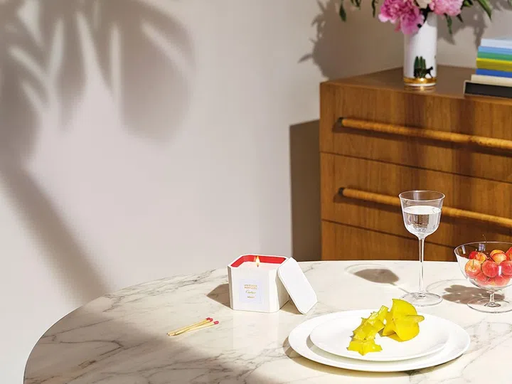 Cartier调香师Mathilde Laurent精心制作的Les Écrins Parfumés Cartier香氛蜡烛取材大自然,希望将这些原始又芬芳的味道浓缩到蜡烛之中,只要点燃它就能让人们仿佛置身旷野之间。蜡烛跟品牌旗下的珠宝一样,华贵至极,陶瓷烛杯以品牌标志性的红盒为蓝本,杯盖以花环点缀,将细节发挥得淋漓尽致。