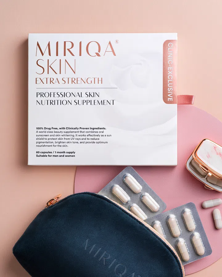 MIRIQA® Skin Extra Strength 专业口服营养补充剂专注于从内调理肌肤。它结合了热带蕨类 Polypodium Leucotomos、番茄精华 PhytoflORAL® 以及橄榄多酚 Hydroxytyrosol,为肌肤提供日常防护,同时帮助均匀肤色、淡化色斑。对于肌肤敏感或刚做完护理的人来说,它还能舒缓炎症、减缓光老化。每天一粒,肌肤慢慢呈现自然的通透感和健康光泽。