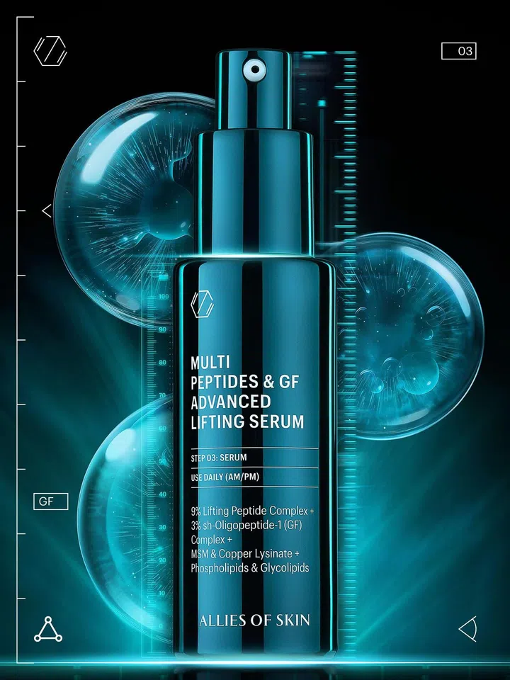 Allies of Skin创始人认为生长因子本来就存在于皮肤中,只不过会随着年龄增长而减少,它们能够刺激胶原蛋白和弹性蛋白增生、修复疲劳肌、提升紧致度、淡化细纹、修复肌肤屏障。Multi Peptides & GF Advanced Lifting Serum超浓缩精华含有3%生长因子复合物、9%提升肽复合物,经皮肤科医生临床证明可显著减额头、眼部轮廓和颈部等细纹,效率高达20%。新品发布: 22/8