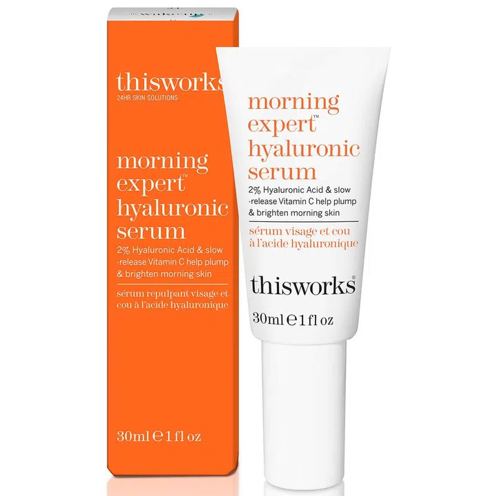 This Works 晨间玻尿酸精华液含有玻尿酸以及维他命C,能够为肌肤补水,把保湿功能发挥到最大化,同时借助维他命C,提升肌肤光泽感和淡化斑点和皱纹。