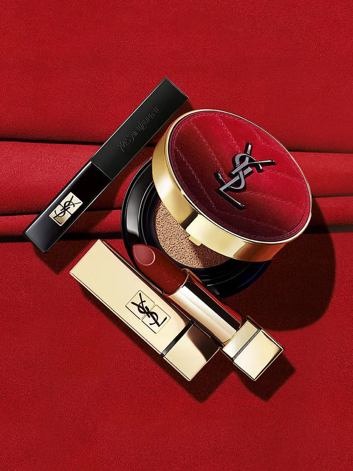 红色有喜庆吉祥之意,在农历年当然要红彤彤的。YSL Beauty 农历年限定款走的是简约大气的奢华风,气垫粉饼Le Cushion Encre de Peau换上来雍容华贵的红色绒布设计,搭配像小金条一样的细管唇膏 Rouge Pur Couture The Slim Velvet Radical,看起来喜气洋洋。