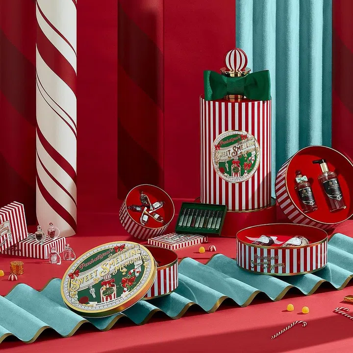 Penhaligon's 的佳节限定款总是散发着浓浓的英伦气息。今年,品牌以圣诞糖果为主题,产品礼盒均以红白条纹设计搭配绿色,非常欢乐。一如既往,圣诞日历外盒是香水瓶设计,内部放置了迷你香水以及各类香氛产品。其他礼盒则是圆形铁盒,其中包括亚洲限定款Luna's Moon Drop。
