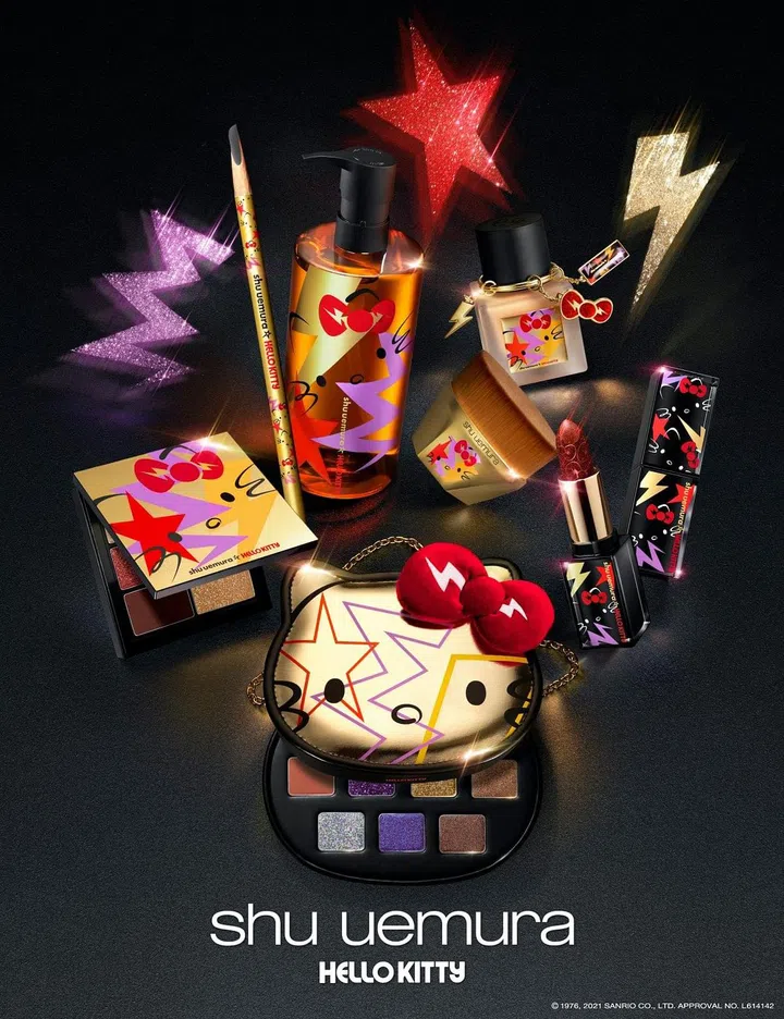 日本植村秀(shu Uemura) 限定联乘系列找来卡哇伊的Hello Kitty,为这位可爱系教主打造个性摇滚风。金色的Hello Kitty 大头以Disco 球为灵感,打开原来是眼彩盒,实用的大地色系搭配个性紫,打造日常彩妆不是问题!另外,唇膏、人气洁颜油、粉底液、粉底刷、唇膏等统统都换上了新装。代言人王一博更拍摄了系列彩妆大片,跟Hello Kitty 一起卖萌。