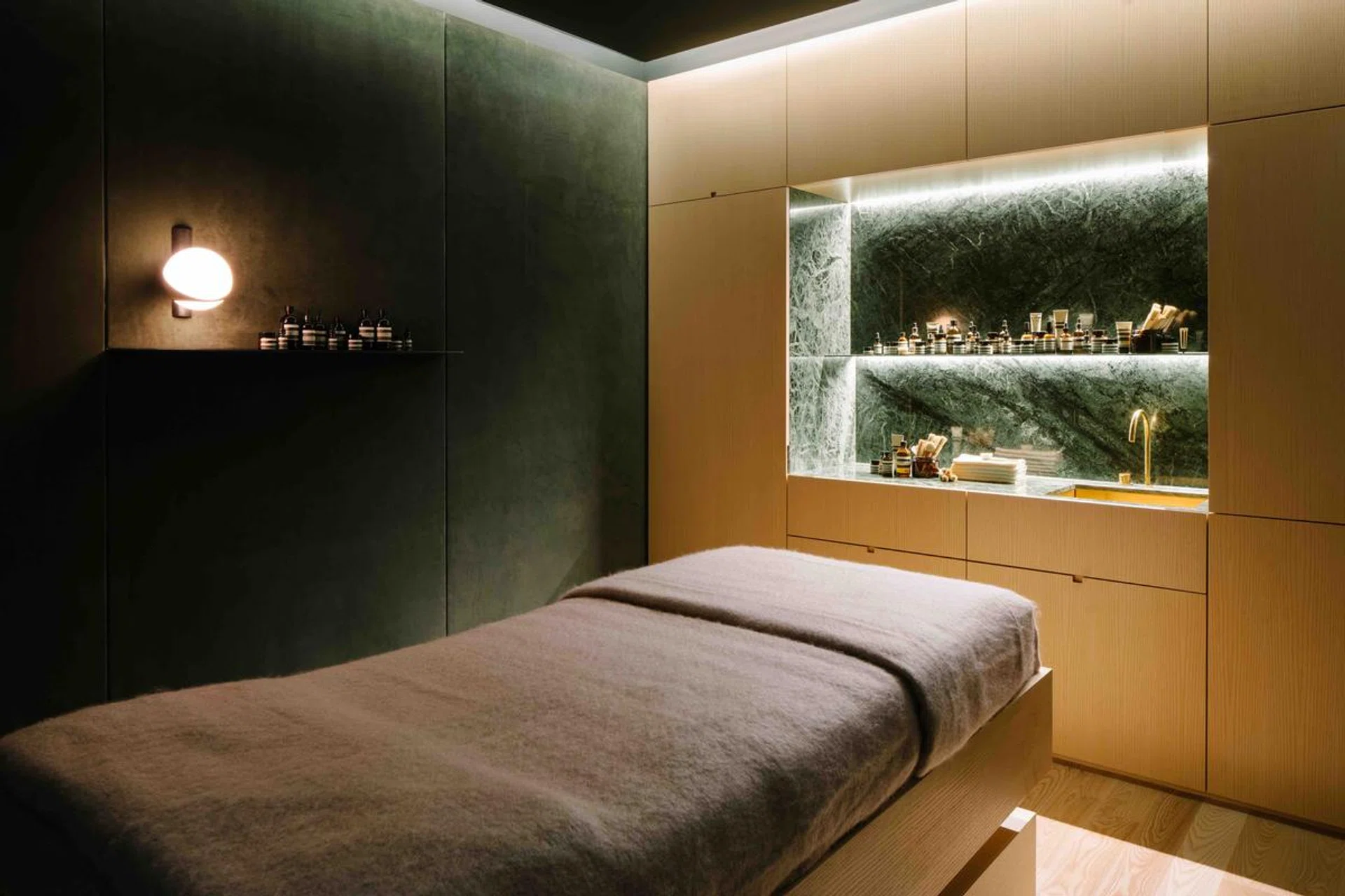 美疗室设计灵感来自于剧院,墙边挂上墨绿色长布幔,连音乐都与众不同,有别于一般舒心轻缓钢琴曲,客人亦可选择起伏较大、充满张力和戏剧性的曲目。