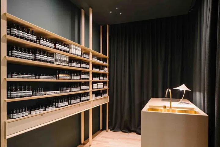 不久前,品牌位于乌节路诗家董(TANGS)专柜迁移到同一楼层另一端,装潢也进行了革新。新面貌以墨绿色为主调,搭配金属,整体看起来精致舒雅,呈现另类轻奢风格。这样的配色与装潢贯彻了Aesop位于四楼脸部护理空间(Aesop Tangs Facial Room )的装潢,延续出一致性和完融的整体感。