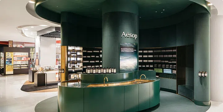 AESOP位于乌节路TANGS换上新貌,结合墨绿与金属,展现简约轻奢感。