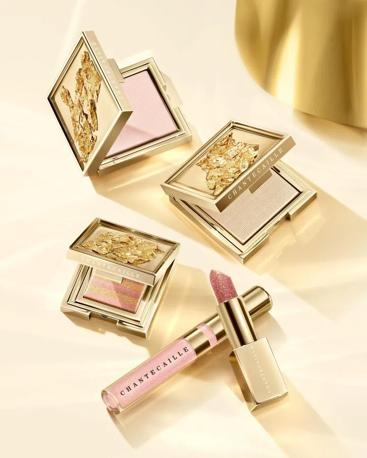 来自法国的香缇卡(Chantecaille) 圣诞限定以鎏金年月为主题,带有闪粉效果的眼影、唇膏以及腮红,加上金灿灿的金箔设计包装,奢华又散发节庆之意。