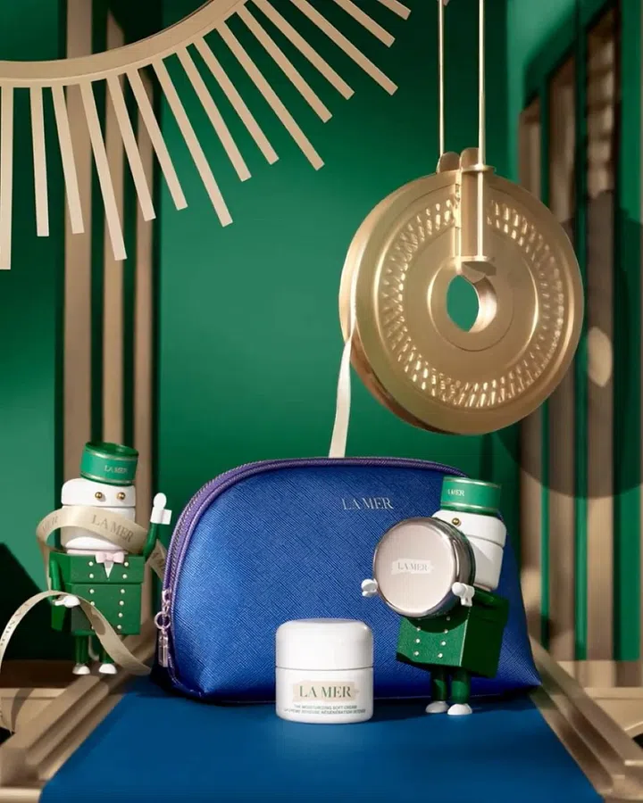 La Mer 今年延续过往,推出多款不同的礼盒组,包括人气滋润面霜、修复精华液等。最有趣的莫过于标志性绿色礼盒上以金色线条会伤了烟花图腾,传递欢乐。更可爱的是以经典面霜为蓝图,设计了面霜porter,身穿绿色制服的porter头像就是白色的面霜罐子,非常逗趣。