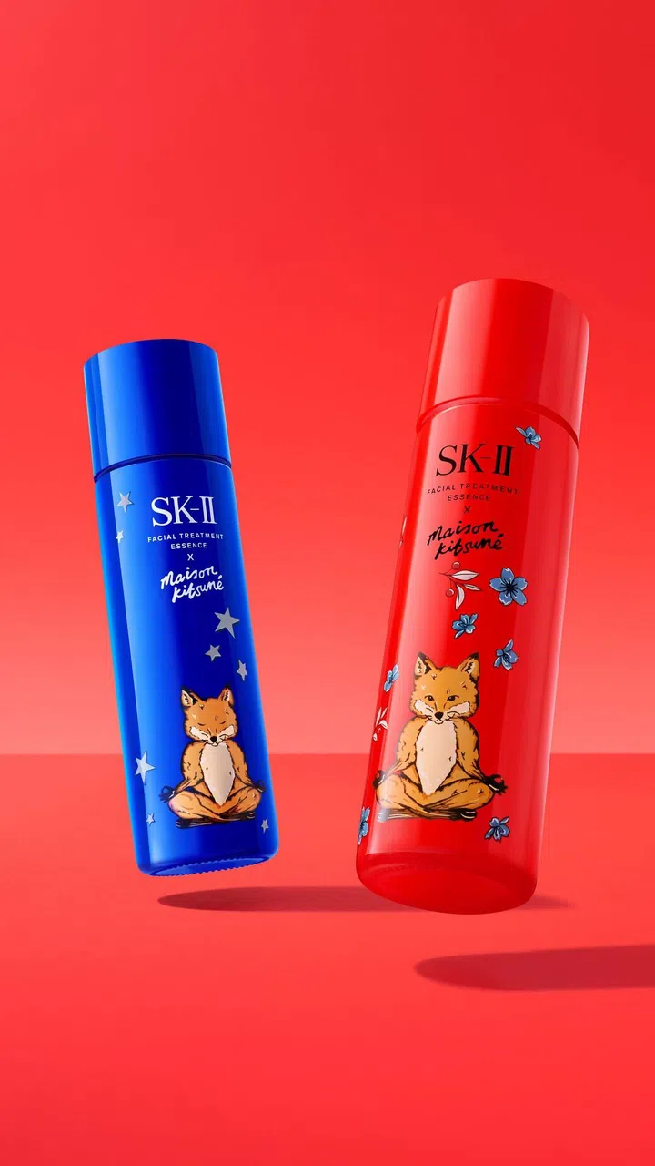 日本护肤品牌SKII与法国时尚品牌Maison Kitsune强强联手,发布一红一蓝瓶装,耀眼夺目的瓶身印制了Maison Kitsune狐狸印花,非常抢眼。