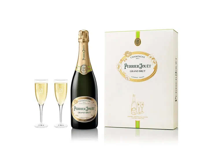 巴黎之花(Perrier Jouet)为佳节打造的 Grand Brut 香槟礼盒,内含一瓶特级干型香槟与两只精美香槟酒杯,流露出品牌时髦典雅的奢华韵味。