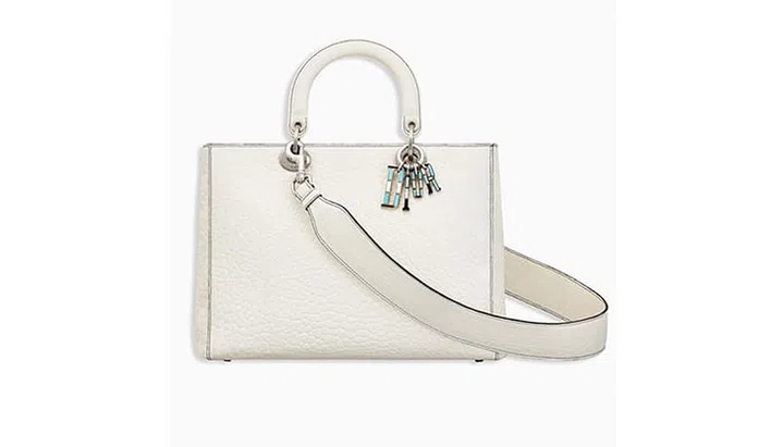 Dior的标志性手袋Lady Dior,在Cruise 2018系列中重新诠释,推出更大尺寸的白色小羊皮款式,搭配迷人的银色金属与水蓝马赛克。