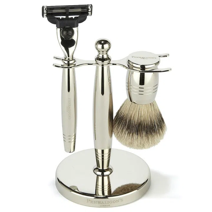 英国品牌的刮胡用品,送给经典绅士。三件式高雅用具以优质材质手工组合,包括剃须毛刷、剃刀及Gilette Mach 3刀片。让男人在家也可自行专业剃须。