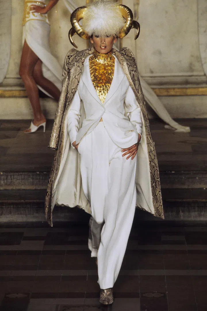 1997年,年仅27岁的亚历山大·麦昆(Alexander McQueen)担任纪梵希的设计总监,为高贵优雅的 品牌注入新血活力。这位天性叛逆的英国设计鬼才, 推出的首个春夏高定系列以希腊神话为灵感,呈现 瑰丽恢弘的设计,以白和金色为主调,挥洒天马行空的创意,让秀场上的女模化身为英姿飒爽的希腊女战神,成就品牌至今仍让人津津乐道的华丽大秀。