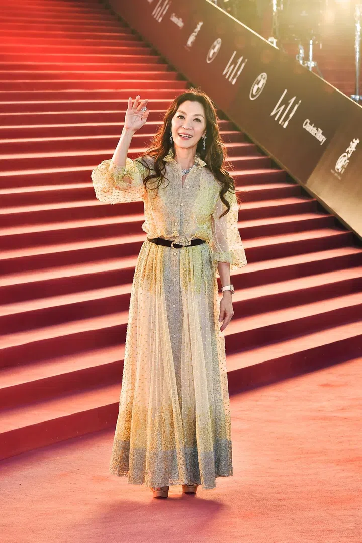 杨紫琼凭电影《妈的多重宇宙》获得奥斯卡影后,成为奥斯卡史上首位亚裔最佳女演员。这回以颁奖人的身份现身第41届香港电影金像,她身穿轻盈的蕾丝Dior长裙缀以精致刺绣,佩戴卡地亚(Cartier)珠宝及理查米尔(Richard Mille)腕表,尽显高雅自信的绰约风姿。