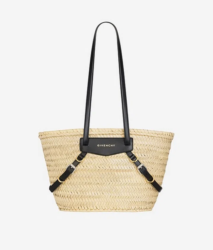 来自Givenchy 2023春夏系列的全新包款——Voyou手袋,亮点在于包身皮革绑带设计。这款篮子包采用天然拉菲草编织而成,黑色皮革绑带自然垂落于包身两侧,细节处装饰水钻,流露出一丝休闲时髦的格调。