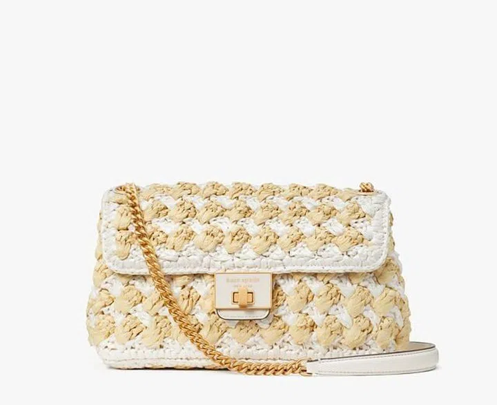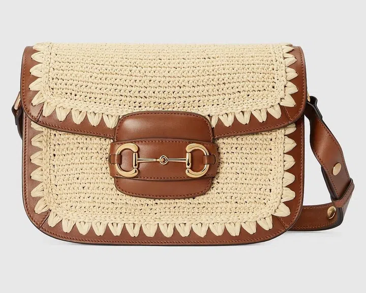 Gucci Summer Stories 2023夏日系列新品延续轻松的海滨度假氛围,品牌标志性的Horsebit 1955肩背包采用自然色拉菲草材质搭配棕色皮革饰边,呼应着自由的夏日主题。