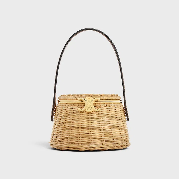 Celine Triomphe圆形化妆盒以迷人俏皮的圆筒形状和金色凯旋扣相得益彰。盒盖上还附带了一面贴心的化妆镜,让你随时随地可以进行化妆。这款化妆盒选用了藤编材质,与夏季度假的时尚装扮完美搭配。
