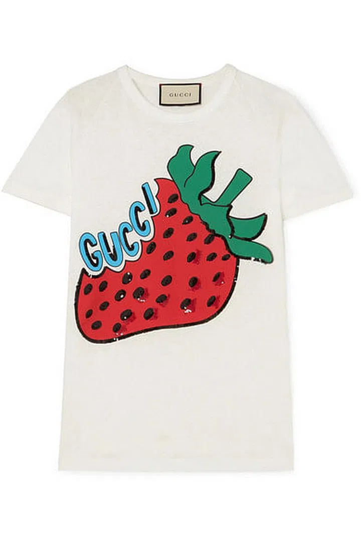国庆节当天,不想在穿着上过于隆重,就可以选择这件以70年代图案和卡通片为灵感的GucciT恤,其正面印有大草莓图案与品牌logo,并在其中缀以耀眼的亮片。若想更巧皮鞋,也可做一套可爱的草莓印花美甲作搭配。