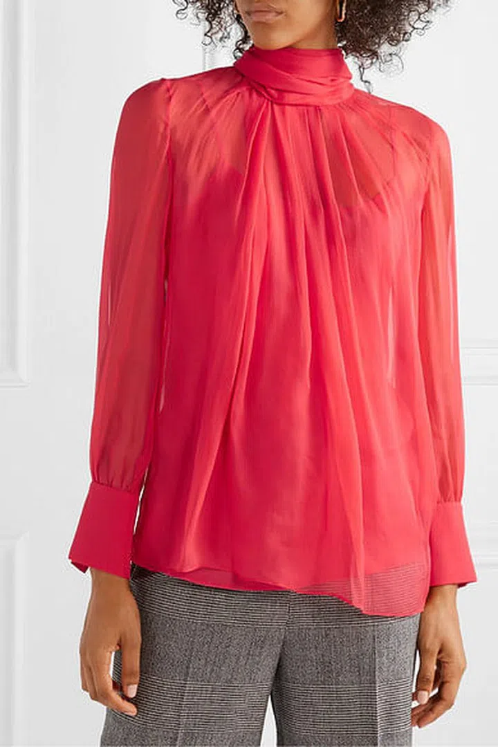 以精细的真丝雪纺制成,廓形宽松的Max Mara高领女衫,适合平日上班或晚上约会时穿着。鲜艳的红色十分符合新加坡国庆节的红/白色主题,褶裥领口处还饰有柔软垂顺的系带,可系成蝴蝶结,在步伐之间灵动飘逸。