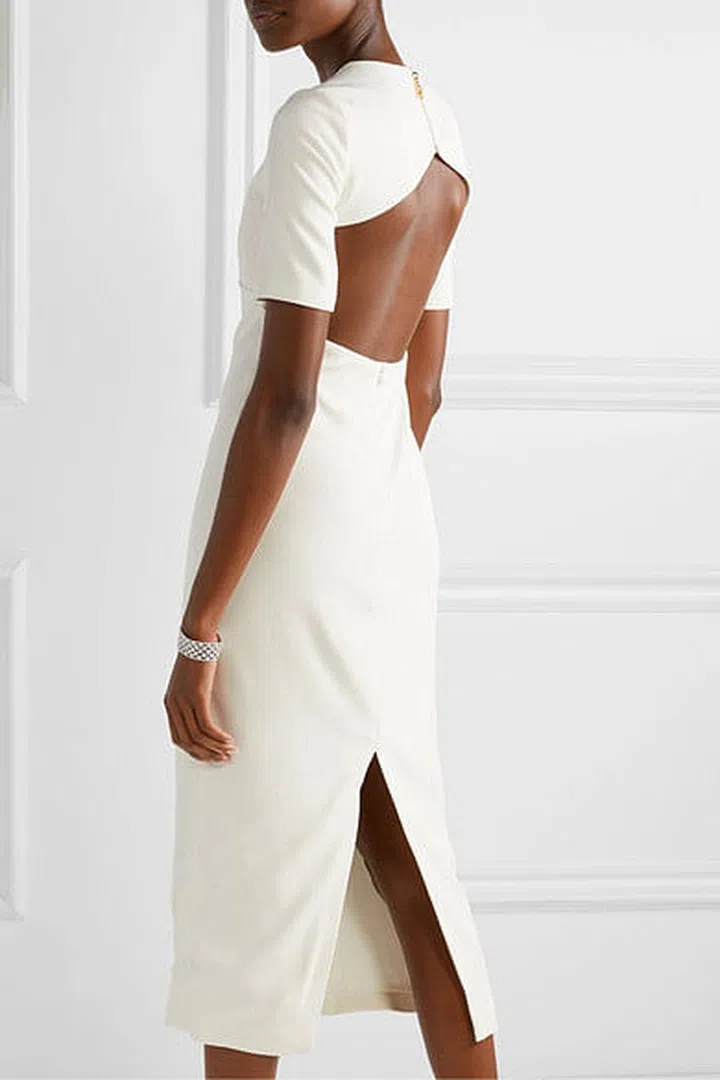 高品质材质、精湛工艺和合身剪裁都是Brandon Maxwell的品牌精髓所在,这身象牙白修身中长款连身裙运用修身的轮廓有助凸显曼妙身姿,一转身背面的挖剪更露出滑嫩肌肤,将性感与优雅集于一身。