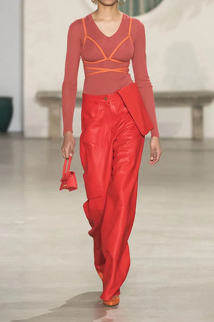 出自Jacquemus2019秋冬系列,这款柔软的亮红色皮革阔腿裤,配有工装风口袋,散发奢华街头风格。建议可搭配同样挺括的衬衫或女衫,配上时髦的迷你包,绝对时髦。
