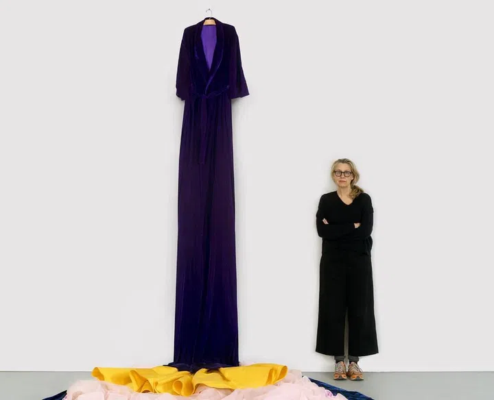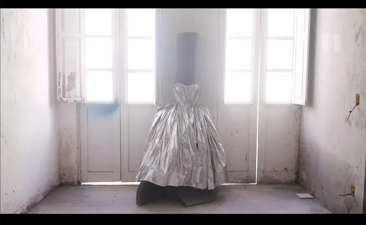 “作品Marigold中,一件明黄色连衣裙被塞进了天鹅绒长袍里面,高高挂在墙上。 裙子从长袍下面垂落并铺展在地,就像美人鱼的尾巴。堆叠的粉色透明欧根纱在‘鱼 尾’下形成波浪,被深蓝、淡粉色的天鹅绒长袖包围簇拥在中心。通过运用面料、胶 带,同时加上亮粉色的带子,手拿包被改装成了萤光黄色的手袋。原本的一双平底鞋现在被改装成了穆勒鞋。