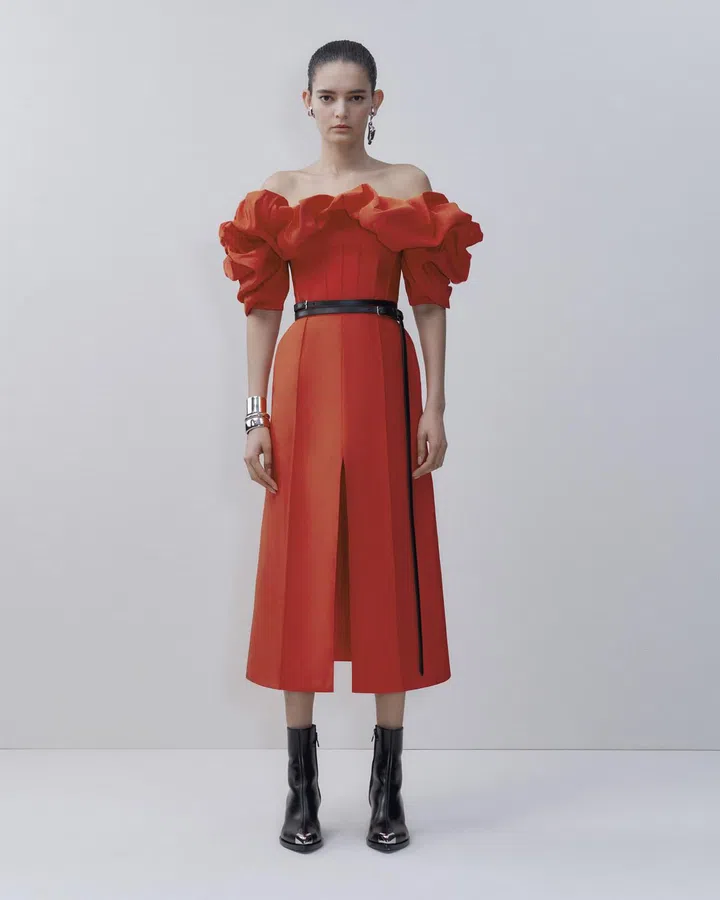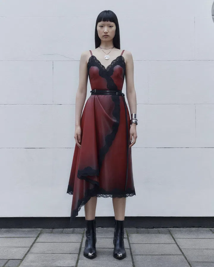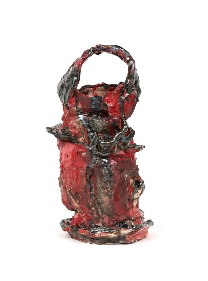 “ 在为Alexander McQueen特别专案创作陶瓷雕塑作品时,我从其 2022 早秋女装系列中挑选出的一个造型进行创作。 我的方法是,先在瓷器转轮上放几个容 器,在它们还是潮湿的时候将它们组合成一个高大的容器,接着贴最初的素瓷、烧制 表面,就像在效仿造型手册中模特儿王涵所穿的亮丽红色皮革连衣裙。我用陶土诠释 经典红色皮革手拿包上的金属四指环,将其展示在容器的顶部和侧面,并用反光钯釉完成润饰。我从迷人的皮革连衣裙上获得灵感,用从红色到深酒红这样的颜色和指环 的金属质感与陶瓷作品相结合,我希望能够唤起一些情感,正如在人生重要时刻穿上 这件衣服的女性所能感受到的那样。”