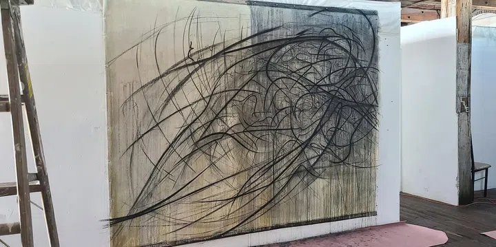 这些线条将非洲、欧洲和美洲 之间的百年贸易体系与现代贸易体系融合,时空塌缩,历史融合,权力和生产系统轮回——这些线条变成了身体,一个抽象的身体——阿米娜女王(Queen Amina)(1533 - 1610)的肖像画,豪萨扎造王国(The Hausa State of Zazzau)的统治者。 Amina专案包括一幅大型绘画作品Amina ,十八件遗迹、碎片和古器雕塑,代表着死亡、屠杀和战利品,它们以头饰及绘有阿米娜王后宫廷虚构成员的四幅小尺寸图画呈现。 ”