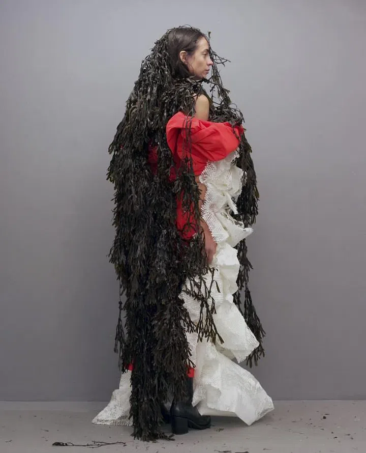 我使用材料的灵感来自海洋以及我们面临的海洋污染问题。 我使用了一种可回收、扩充 的包装纸来代表涉及碳排放量的全球贸易。材料采用镭射切割,以达到像网一样的拉伸效果,网状寓意了我们不可持续的水产业。我同时用海藻来代表自然世界。 ”