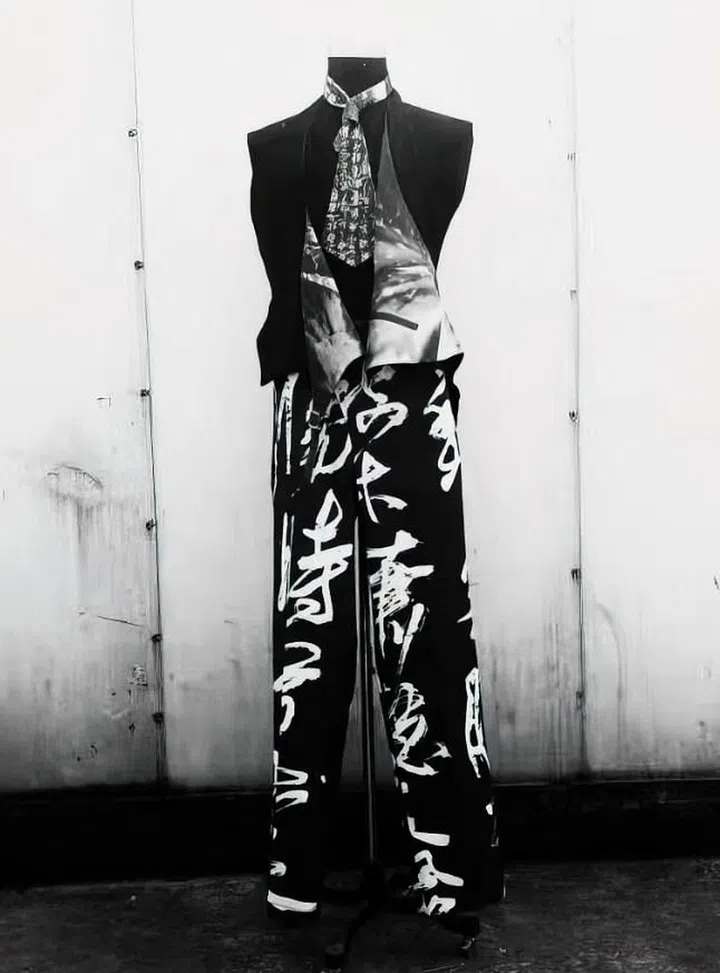 “这件裙装的表现意义有两层:婚礼仪式展示了从壮美自然为起点,以人类力量为终结的过程。然而,婚姻的整个过程,男女双方从隆重的仪式开始,慢慢失去,最后只剩下自己成为对方的依靠。男士礼服上印着爱的寄语。他被描绘成了一封‘哭泣的情书’。这场婚礼是自然与人的结合,也是绘画与书法的结合。”