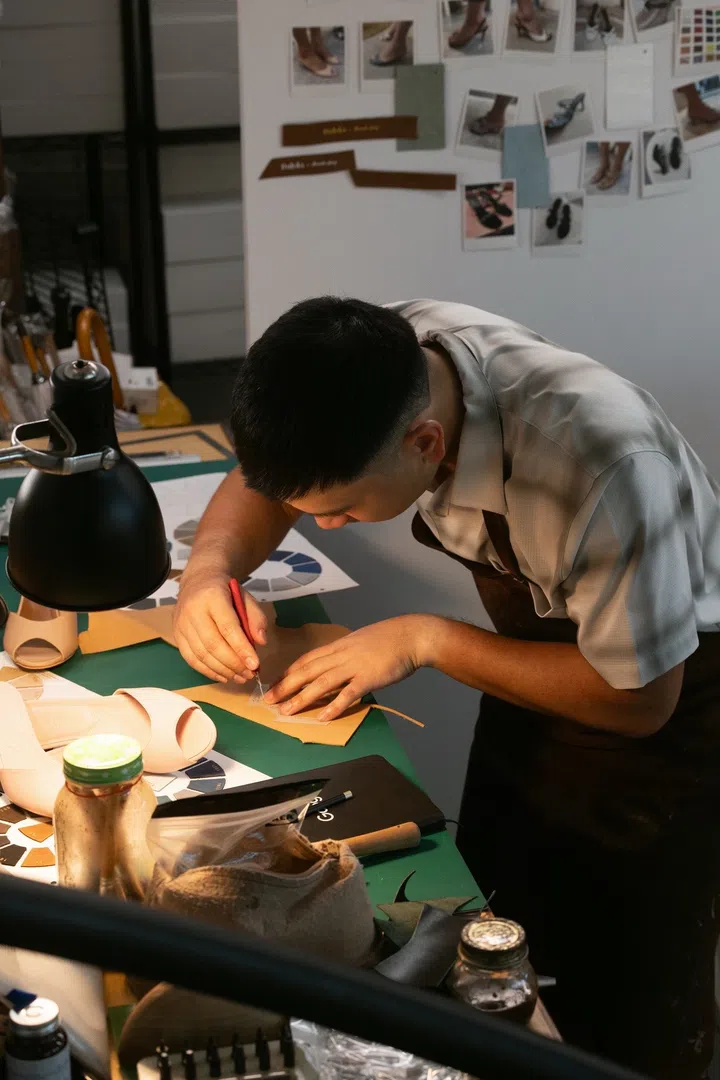 Palola是新加坡唯一专注于女性手工鞋履的品牌,每一双鞋都由工匠们在自家工作室亲手打造,独具匠心。我的合作伙伴——Palola联合创始人Josh Leong,就是一位经验丰富的定制鞋匠。他曾为了梦想,只身前往意大利学习制鞋工艺,从零开始,一步步磨练技术,并把这门传统又珍贵的技艺带回新加坡。当我第一次联系Palola表达想要合作的念头时,一切就自然而然地成型了。Josh的专业和细腻,精准捕捉我对鞋履的想像,把纸上灵感转化为现实,变成可以穿上的梦想。