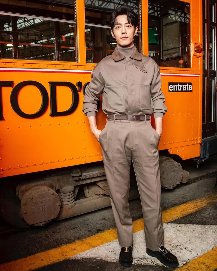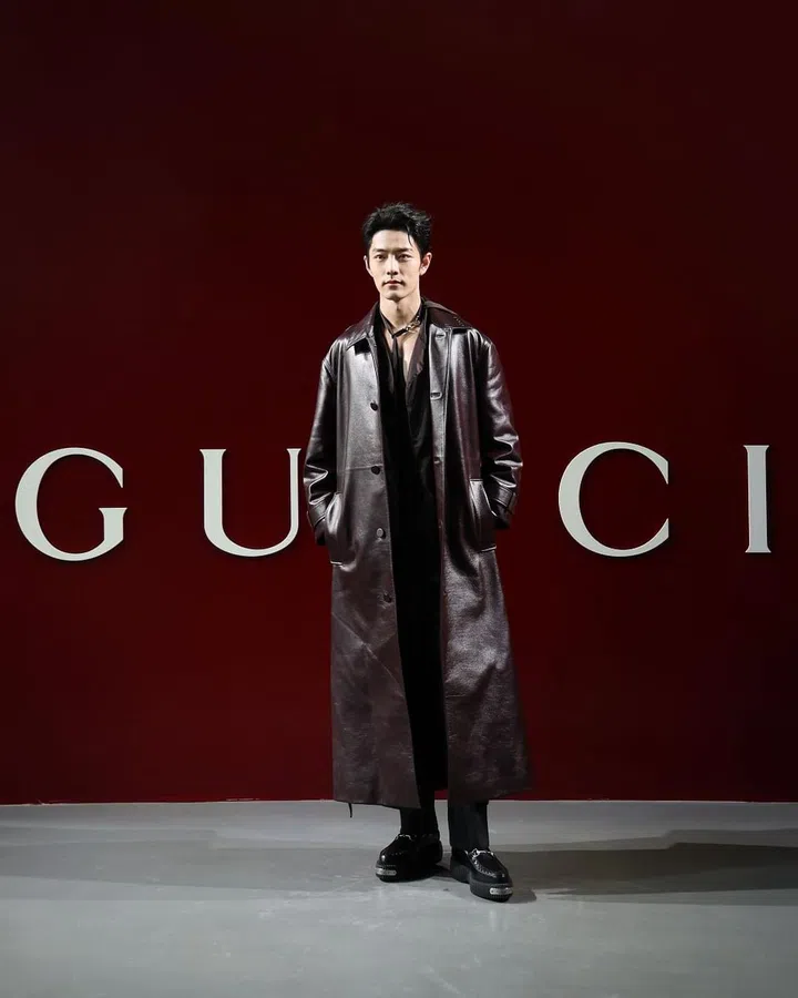 演员、歌手及品牌代言人肖战现身Gucci秋冬大秀,身穿黑色西装,外搭咖啡色长版皮革大衣,脖子上的配件吊饰,轻松提升整体造型的时髦感。