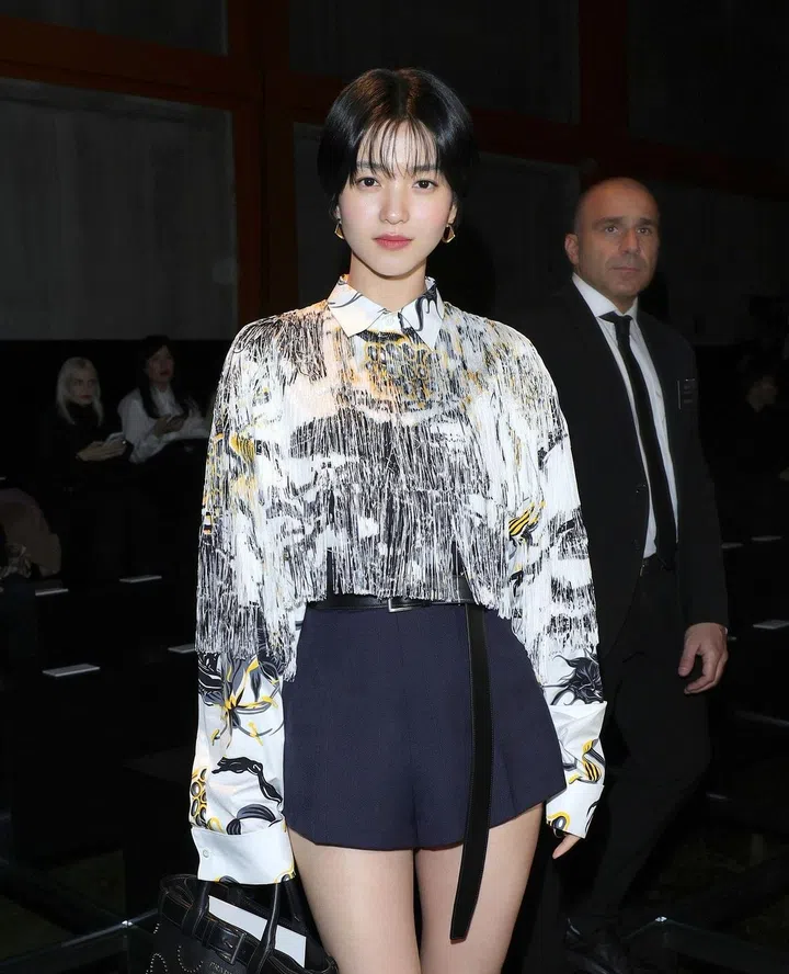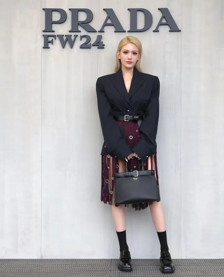 Prada代言人Jeon Somi身穿Prada 2024春夏系列宽松西装外套搭配银扣流苏短裙,巧妙拉长身材比例,挥洒飒爽霸气。