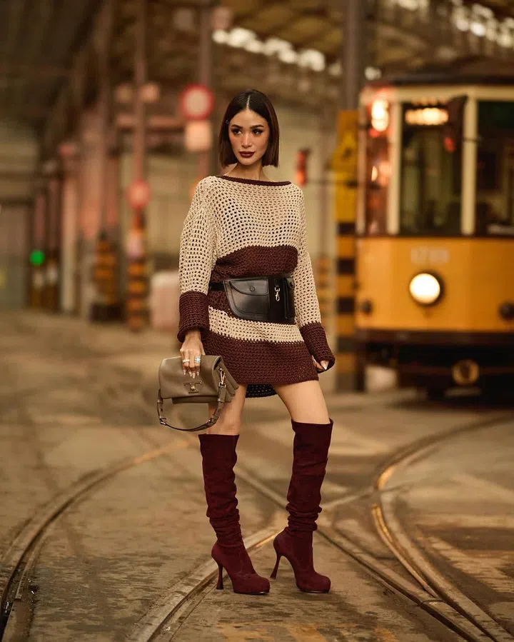 菲律宾时尚女王Heart Evangelista身穿针织长款上衣,搭配长筒靴和手袋,腰间的粗腰带勾勒苗条身材,看起来霸气十足。