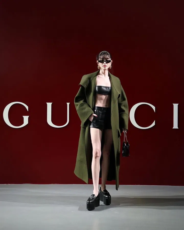 泰星Davika Hoorne(Mai)以品牌代言人之姿出席时装秀,身穿皮革胸衣与短裤套装,外搭一件宽松长版外套,露出冰块腹肌,性感又不失潇洒。