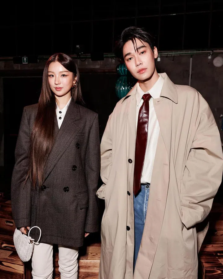 “泰国花泽类”Dew以一袭白色衬衫搭牛仔裤,外披灰白色风衣,帅气现身Bottega Veneta秀场。同场的前排嘉宾还有泰国女星Thanaerng,宽松咖啡色双排扣西装大衣尽显女星的干练利落。