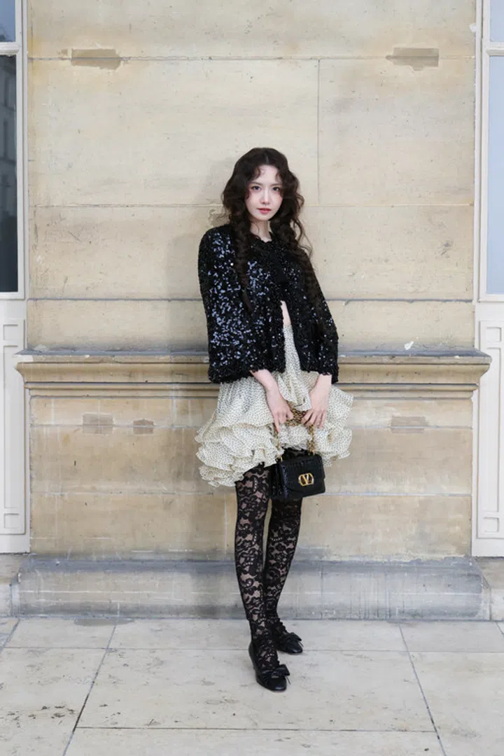 韩国品牌大使Yoona身穿Valentino亮片外套搭配波点蛋糕裙及黑色蕾丝袜,梳着辫子头,俏丽且充满活力。