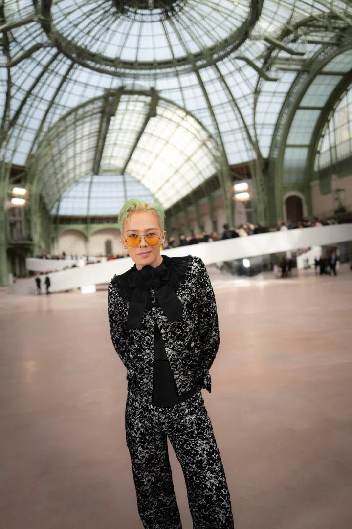 最会穿香奈儿的男人G-Dragon以全新绿发亮相,他身穿黑色荷叶边套装,搭配橘色墨镜增添色彩,帅气十足。