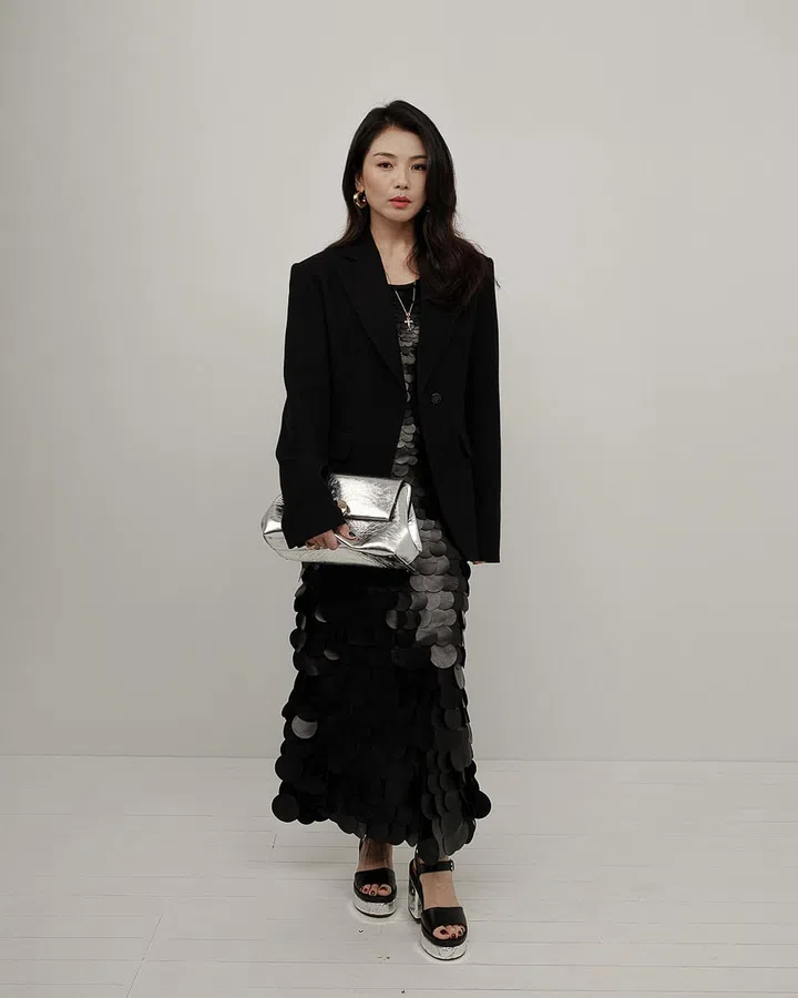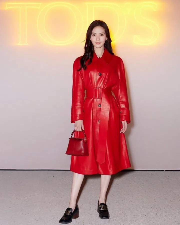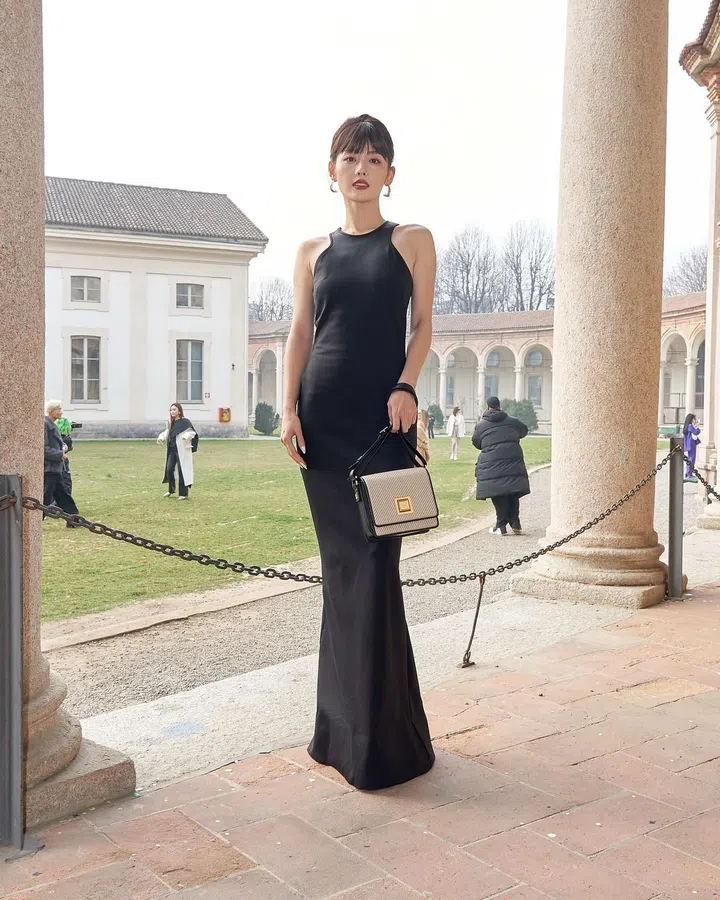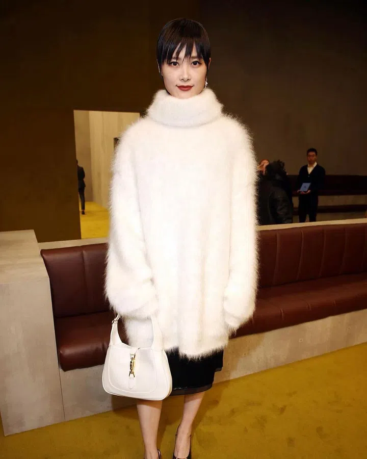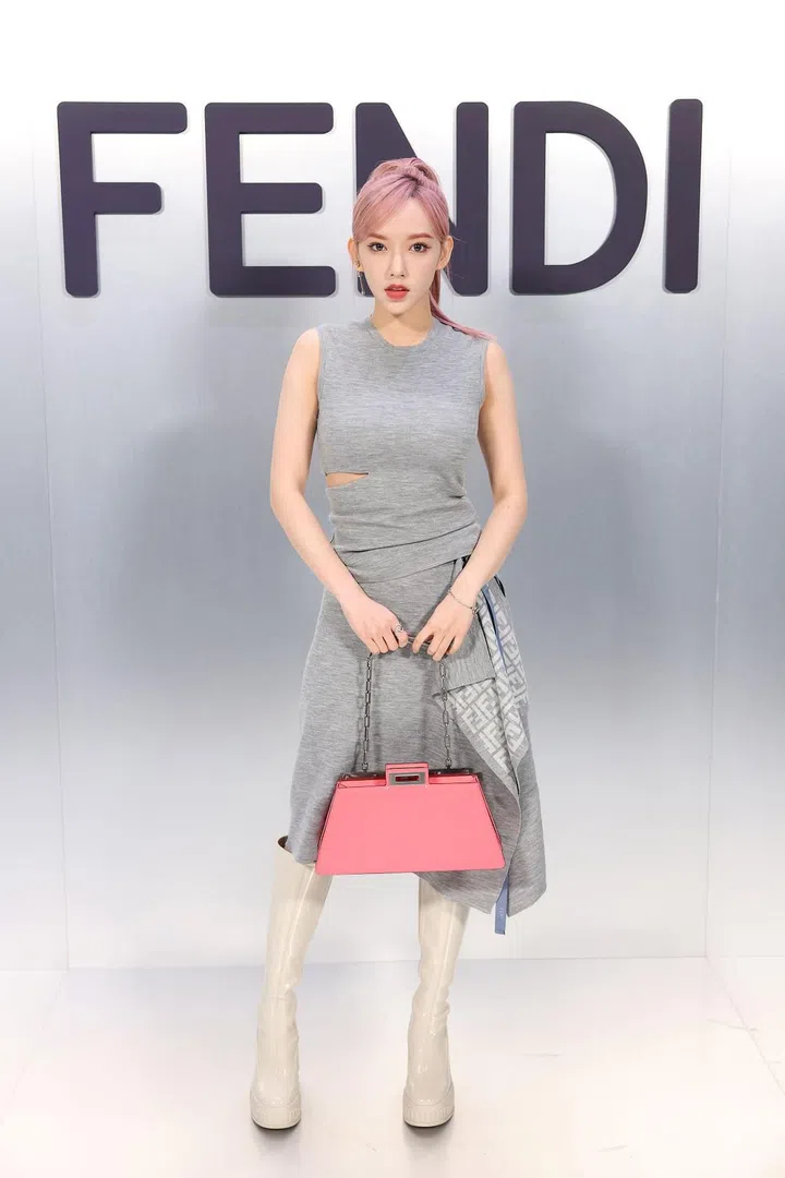 中国演员程潇身穿Fendi灰色针织套装,剪裁修身大方,裙子的折叠设计巧妙展现经典FF标志,是一套不容易过时的精致穿搭。
