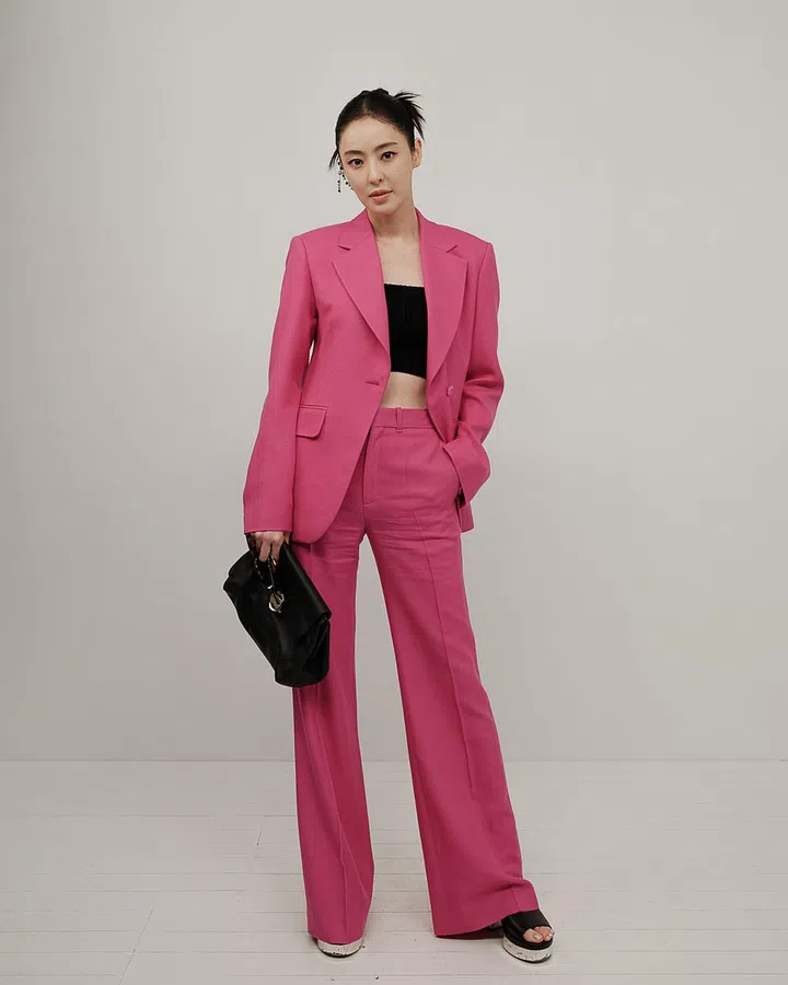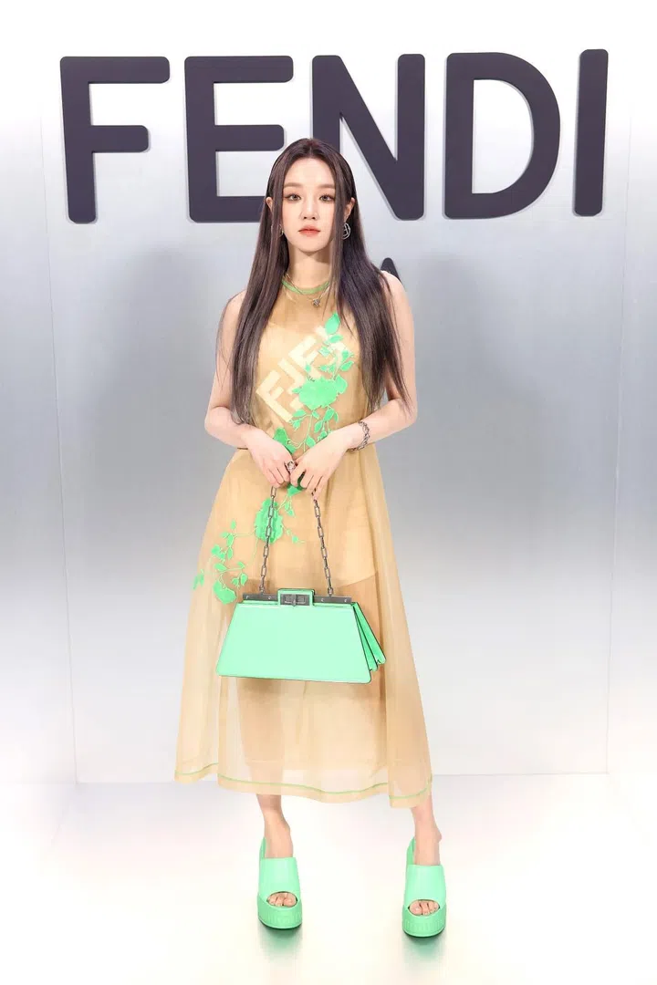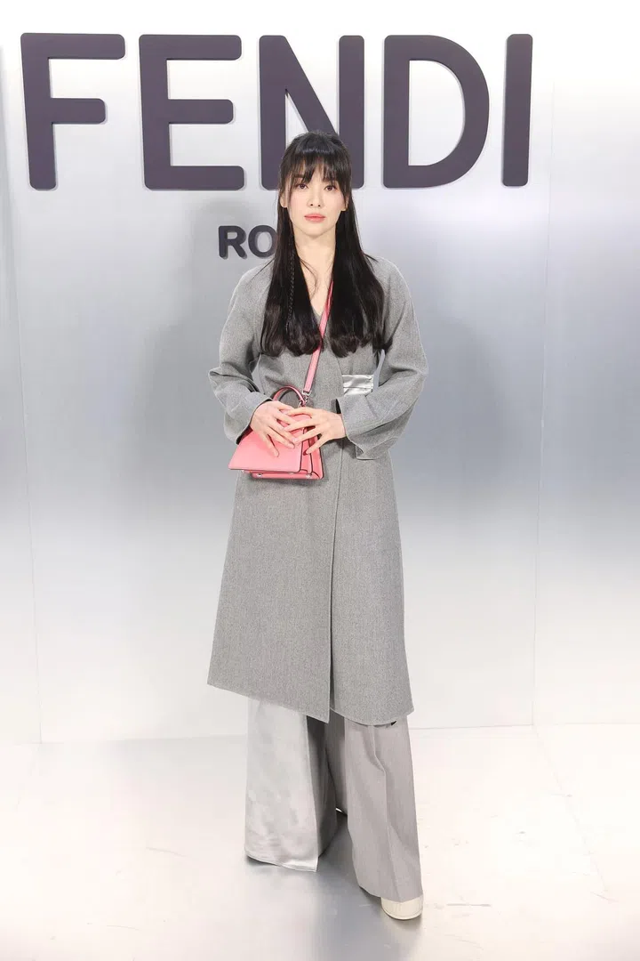 韩国女神宋慧乔选择了Fendi灰色大衣配上同色系西装长裤,斜背Peekaboo ISeeU手袋,优雅又利落,再度惊艳全场。
