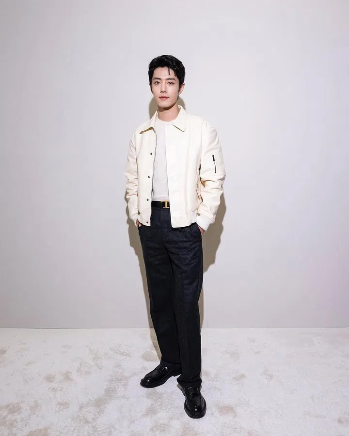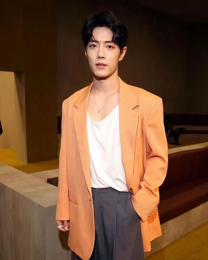 Gucci品牌代言人肖战身穿Gucci 2023秋冬系列橘色西装外套,搭配简约阔腿裤,以明快色彩辉映摩登绅士态度。